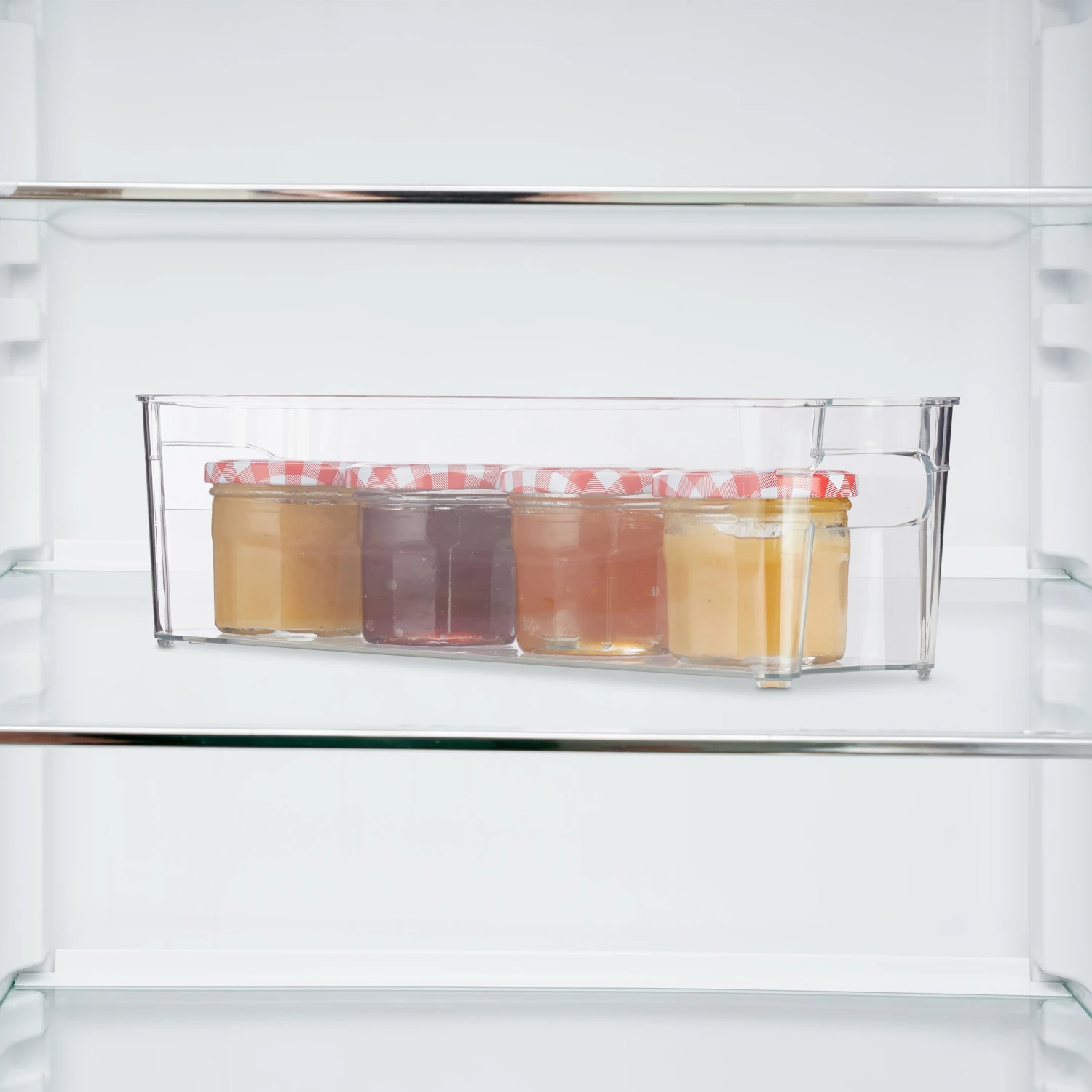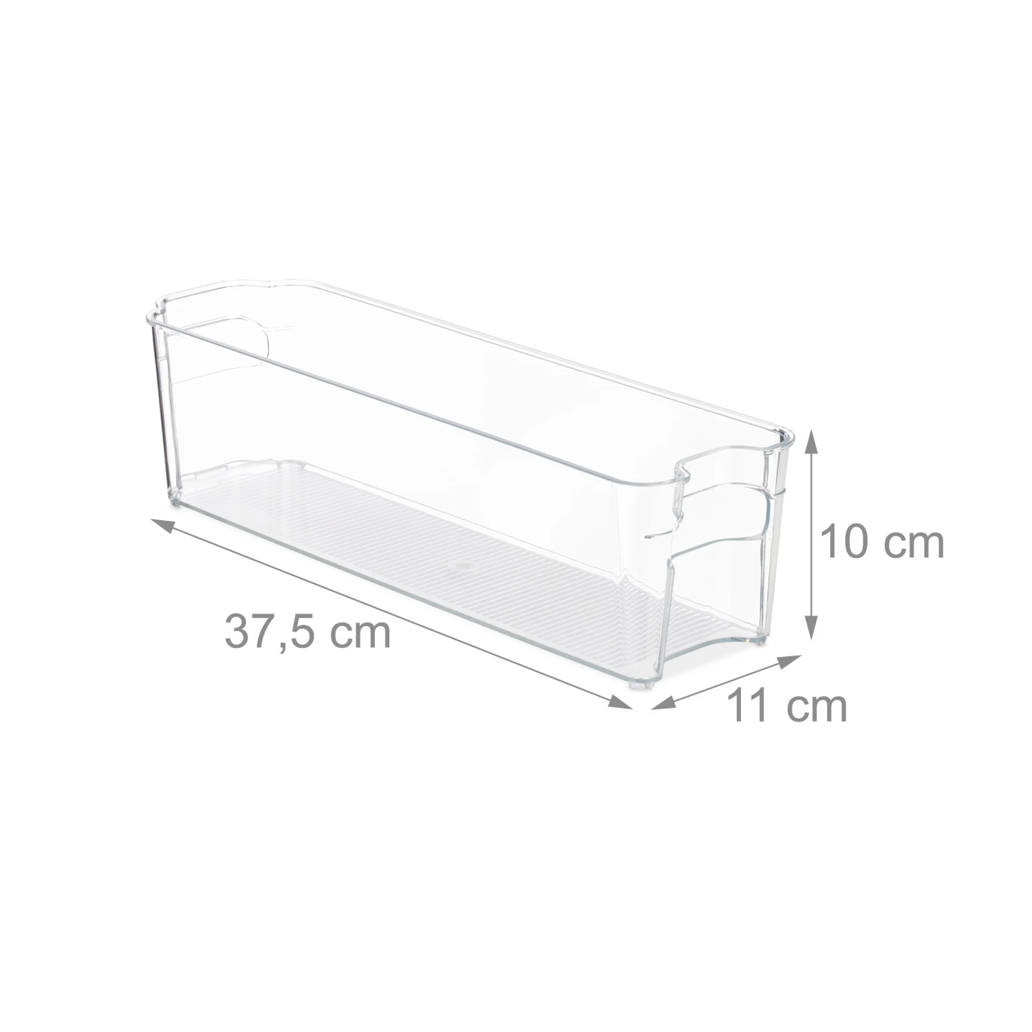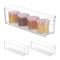 Ein unaufgeräumter Kühlschrank sorgt dafür, dass Lebensmittel schnell übersehen werden und schließlich ungenießbar weggeworfen werden müssen. Mit diesem Küchen Organizer schaffen Sie Ordnung im Chaos. Die schmale Box kann im Kühlschrank zur Aufbewahrung von Joghurt- und Quarktöpfchen oder Smoothies sowie im Küchenschrank für Backpulver, Nudeln oder Gewürze verwendet werden. Dank des transparenten Design des Kühlschrank Organizers haben Sie dabei jederzeit einen guten Überblick über den Inhalt.
