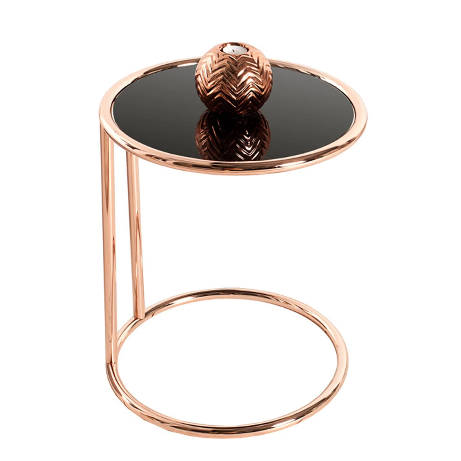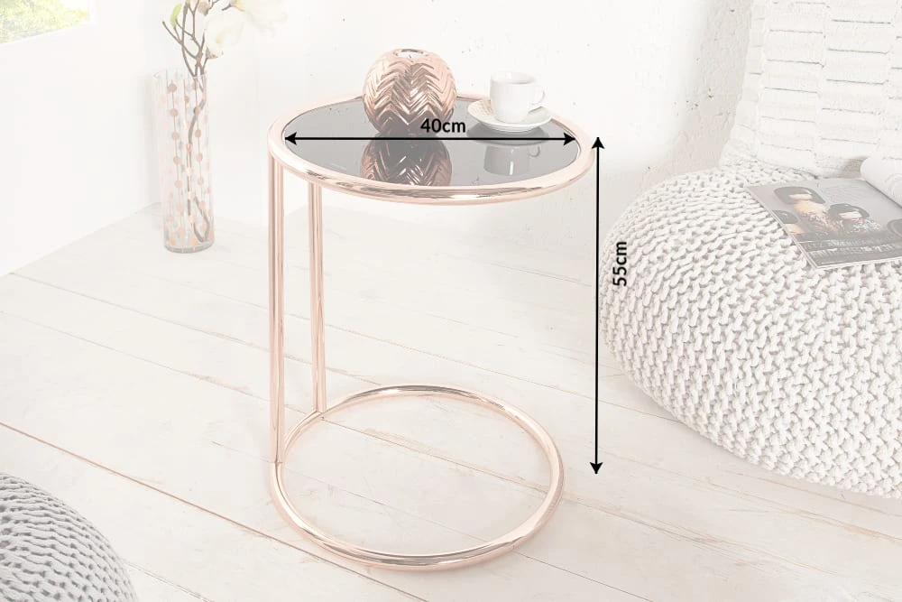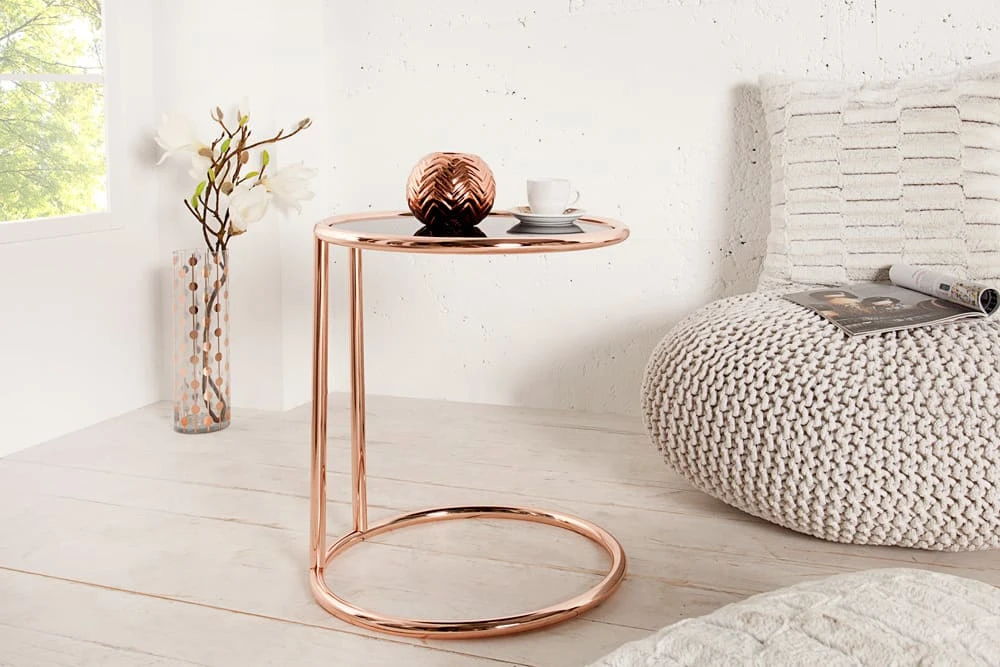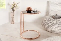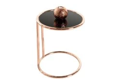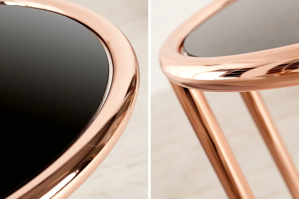 Der Design Beistelltisch ART DECO verbindet ein kupferfarbenes Gestell mit schwarz glänzendem Glas
