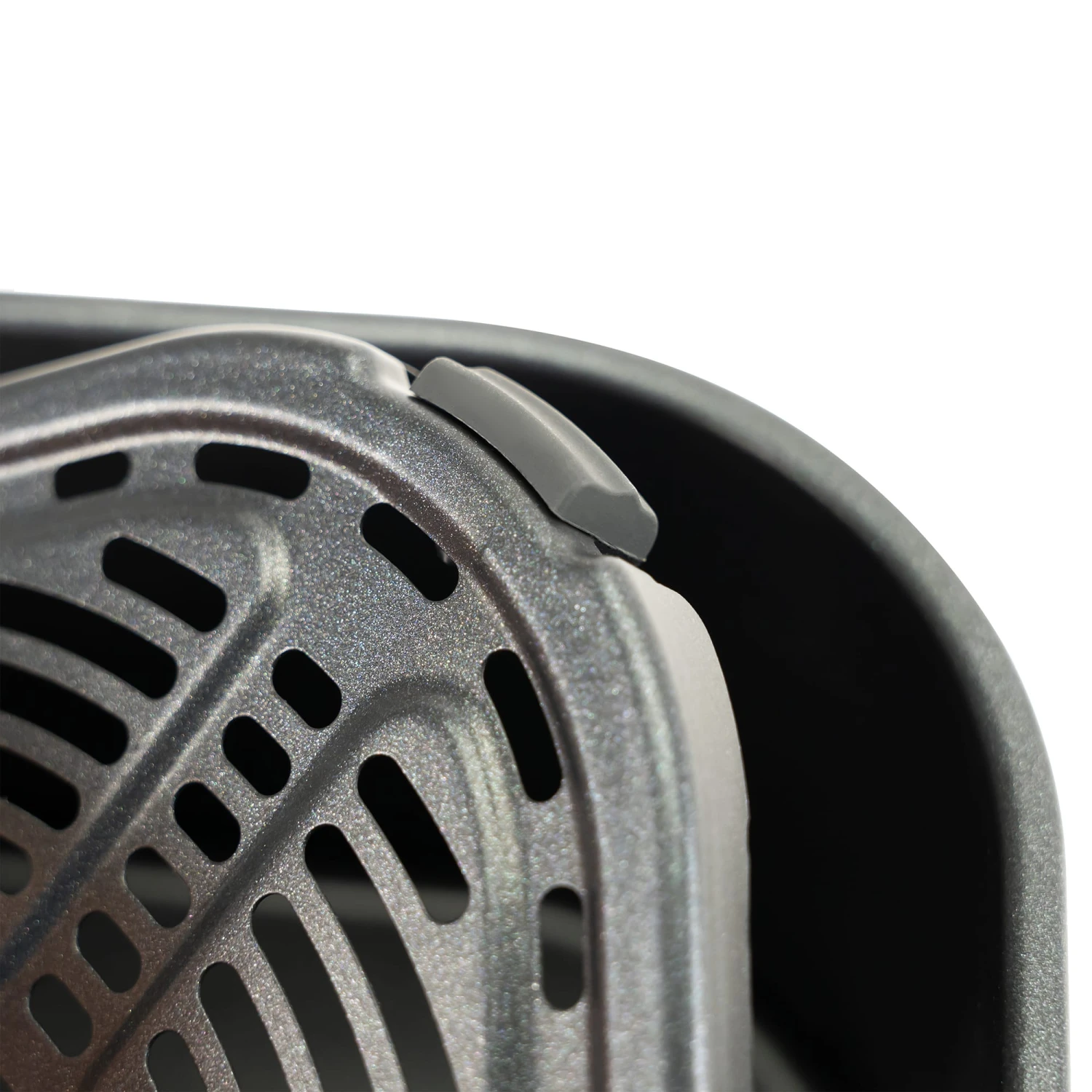 Ausgestattet mit unserer antihaftbeschichteten Knusperplatte, die durch die CrispFit (TM)-Technologie mit Silikonecken gesichert ist, die die Reibung beim Einsetzen der Knusperplatte minimiert, um ein Verkratzen der Antihaftbeschichtung des Korbes zu vermeiden.