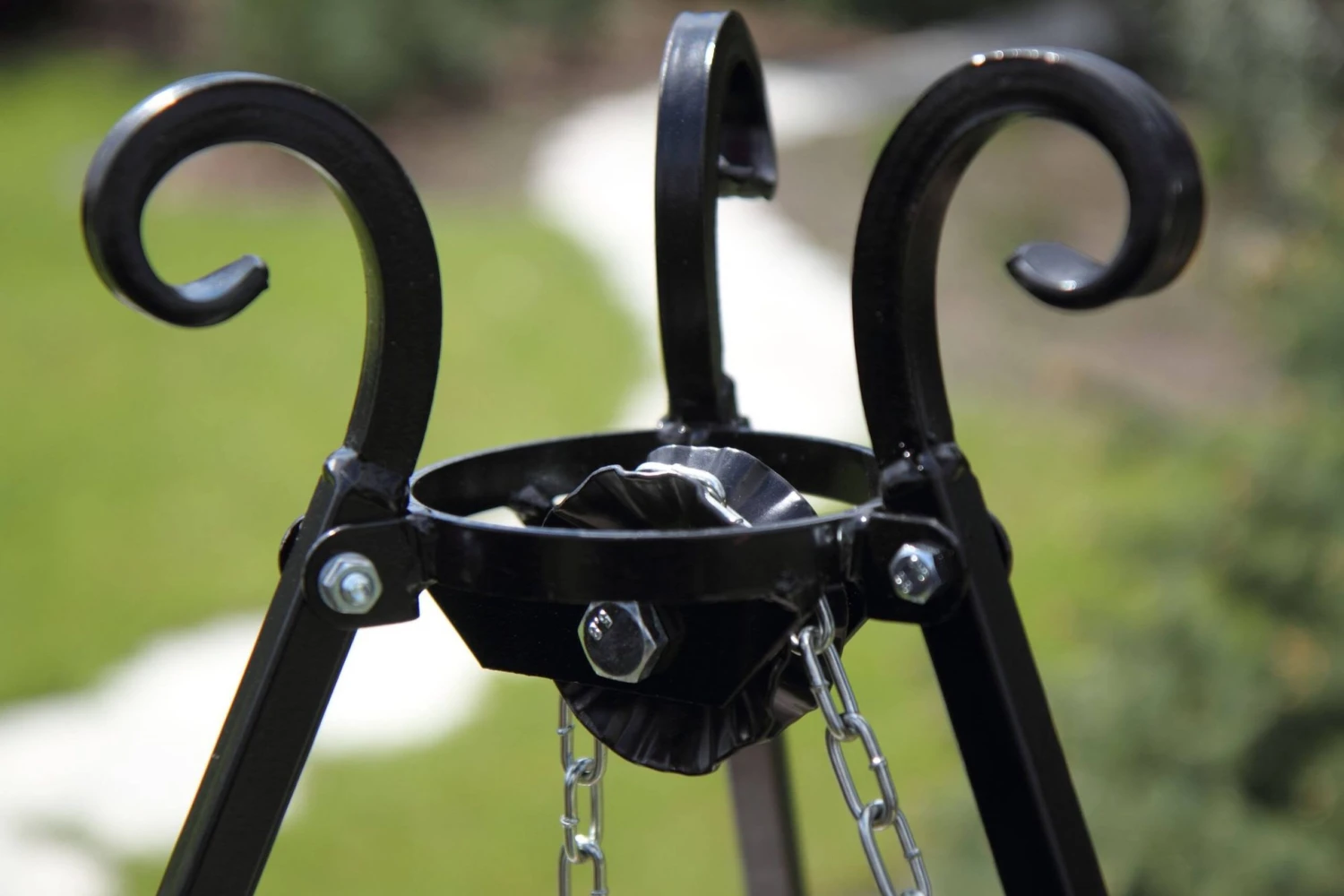 Das attraktive und praktische Dreibein-Gestell ist mit geschmiedeten Verzierungen versehen