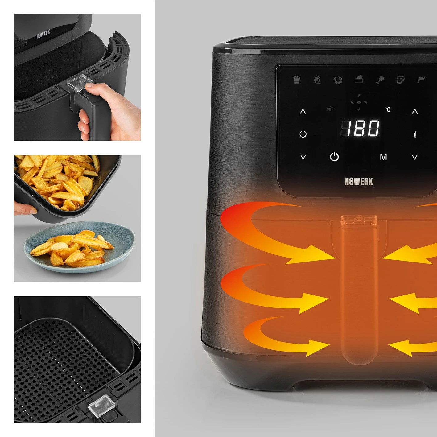 Einfach und fettarm auf den Punkt frittieren. Mit deiner N8WERK Heißluft-Fritteuse in der Midnight Edition.