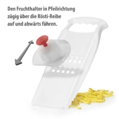 In Kombination mit dem mitgelieferten Fruchthalter koennen Sie ruckizucki sowohl rohes als auch gegartes Gemuese zu Roesti-Schnetzel verarbeiten.