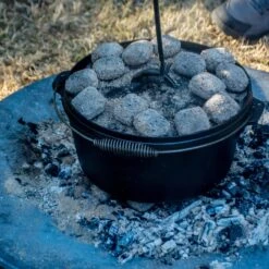 Mit diesem Camping Topf holen Sie sich einen echten Brat-Allrounder. In dem Gusseisen Bräter zaubern Sie genussvolle aromatische Gerichte mit Fleisch, Gemüse und Fisch. Stellen Sie den Gusskessel dank seiner Standfüße direkt ins Feuer oder hängen Sie ihn mit dem Henkel darüber auf. Auch auf dem Herd oder im Ofen kann der Feuertopf verwendet werden. Dank der Fertigung aus eingebranntem Gusseisen verteilt sich die Wärme im Grilltopf mit Deckel gleichmäßig und der Inhalt bleibt länger warm.