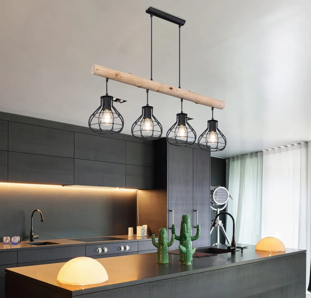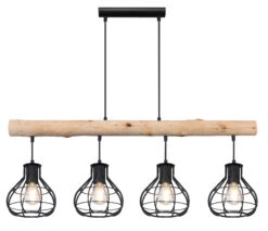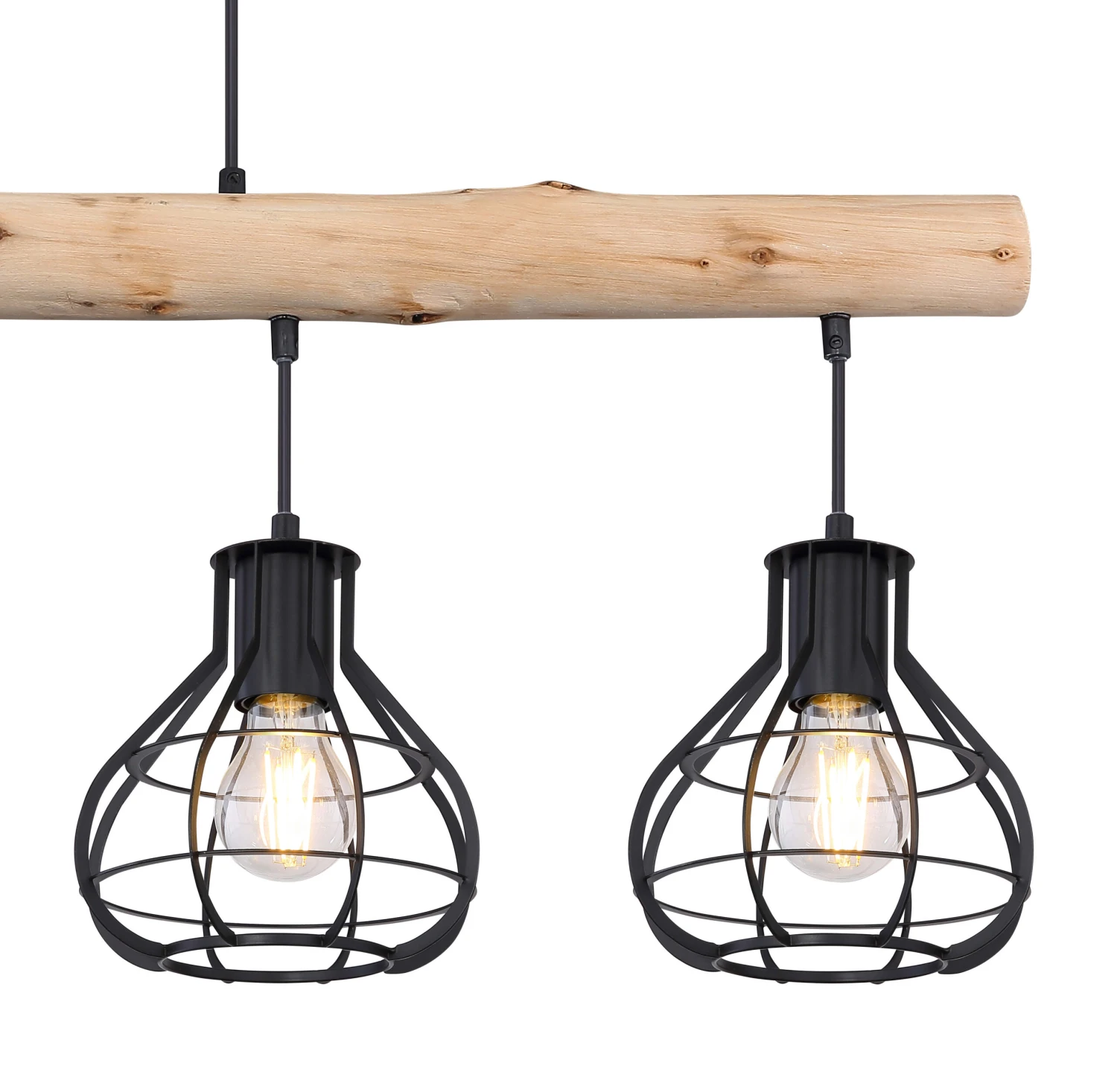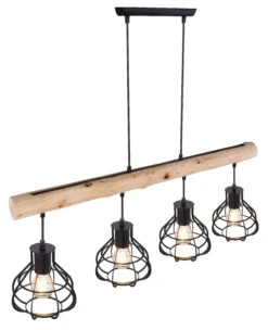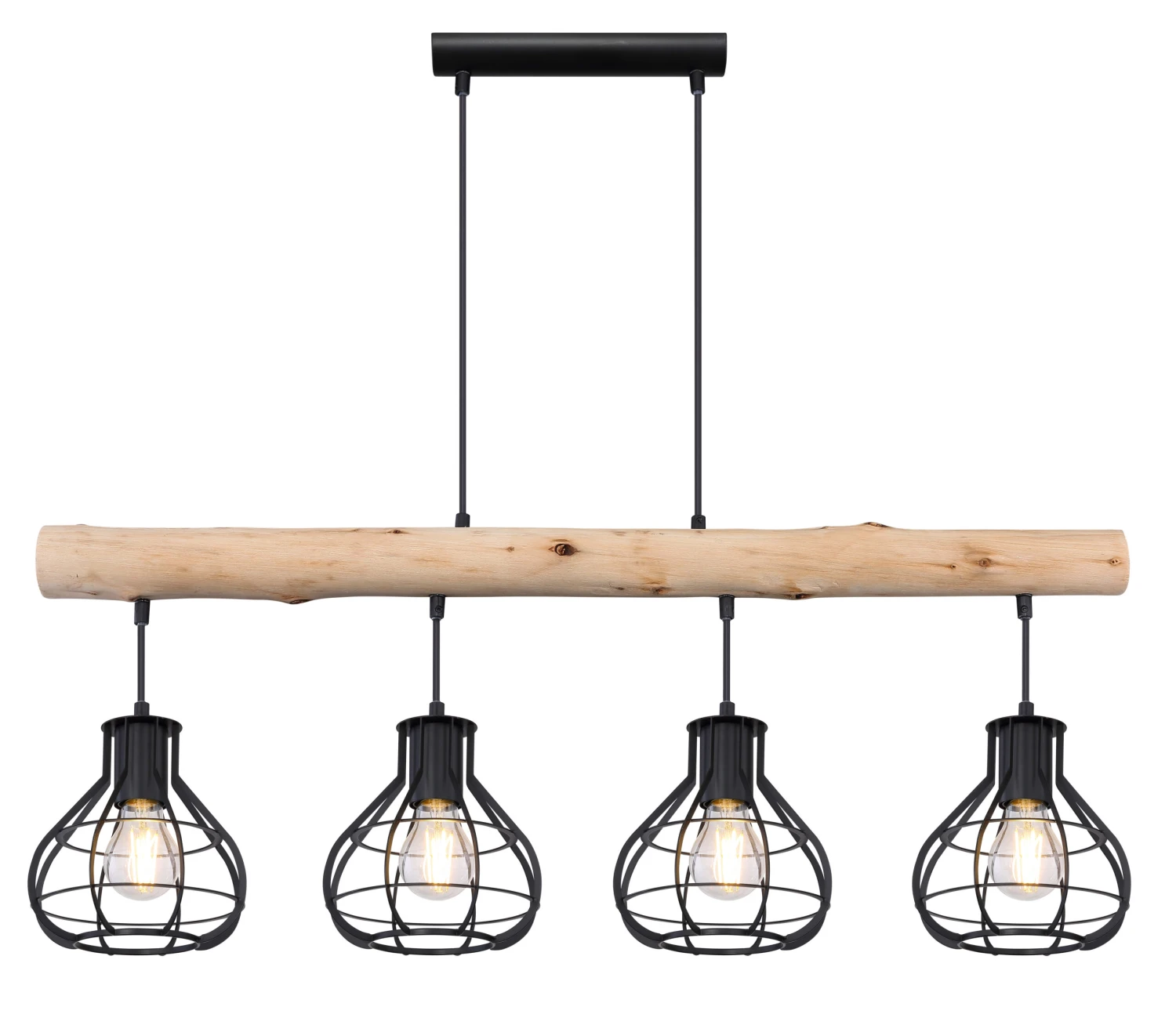 Hängeleuchte Metall schwarz matt, Holz naturfarben, Metall schwarz matt, Kabel PVC schwarz, LxBxH: 900x180x1200mm, exkl. 4x E27 60W 230V