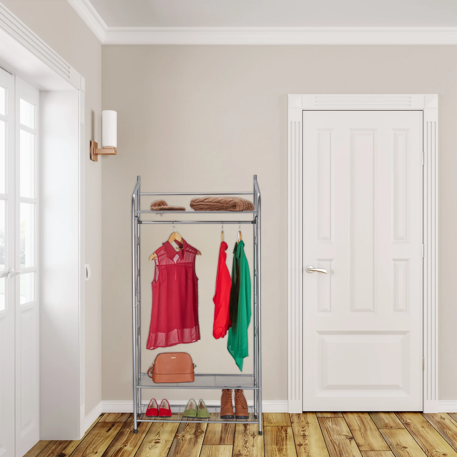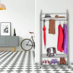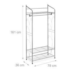 Dieser verzierte Kleiderständer bietet Dir jede Menge Stauraum im Flur oder Schlafzimmer und überzeugt mit seinem offenem Design. Hänge Deine Hemden, Blusen und andere Kleidungsstücke übersichtlich an der Garderobenstange auf. Auf den Schuhablagen finden bis zu 6 Paar Deiner Schuhe oder Taschen ihren Platz. Für Hüte und Ordnungsboxen bietet sich die obere Ablage ideal an. Dank des schlichten Looks aus Metall fügt sich das Kleidergestell in jeden Einrichtungsstil perfekt ein.