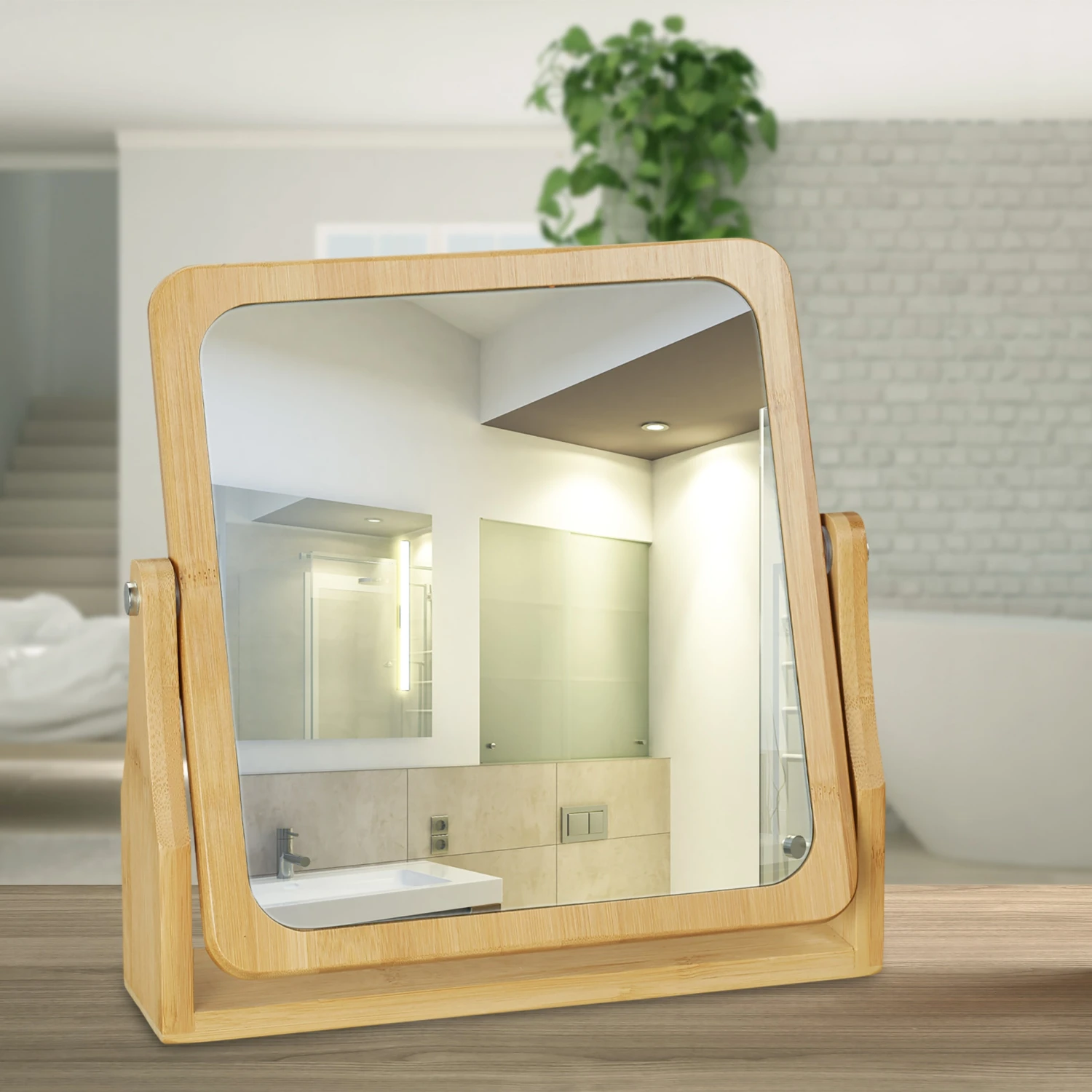 Mit diesem großen Gesichtsspiegel haben Sie sich beim Schminken, Haarstyling oder Augenbrauen zupfen immer voll im Blick. Den 360 Grad drehbaren Spiegel können Sie individuell auf Ihre gewünschte Sichthöhe einstellen. Der rechteckige Tischspiegel braucht dabei wenig Stellfläche auf der Badezimmer Ablage oder dem Schminktisch und fügt sich mit seiner natürlichen Optik aus Bambus optimal in viele Wohnstile ein. So gelingt das morgendliche Zurechtmachen oder das Stylen vor dem Weggehen mit links.