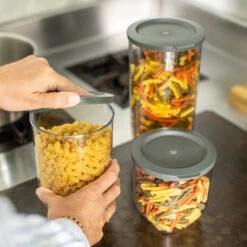 Von Mehl, Zucker und Nudeln über Cornflakes und Nüsse, CONNECT DRY STORAGE hat für alles Platz, was luftdicht und aromaschonend aufbewahrt werden soll. Die Dosen kommen in hochtransparentem Material, so sieht man gleich, was drinnen ist und muss nicht lange suchen. Die farbigen Deckel helfen zusätzlich bei der Unterscheidung. CONNECT DRY STORAGE ist in drei Größen erhältlich, alle Dosen sind stapelbar und miteinander kombinierbar. •luftdicht•mit Sichtfenster•stapelbar •Füllmenge: 1000 ml•3 kombinierbare Größen•100% CO2-neutral KOZIOL THERMOPLASTIC