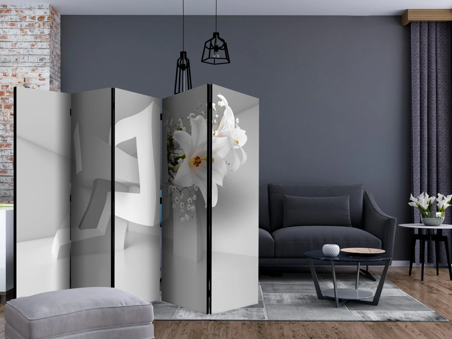 Dekoratives Paravent „Twisted Illusion II [Room Dividers]“ ist ein besonderes Schmuckstück für die modernen Inneräume. 5-teilig, hergestellt aus Holz und beidseitig bedrucktes Paravent teilt nicht nur diskret den Raum sonder kreiert auch in dem Raum ein fabelhaftes Arrangement. Perfekte Herstellung sowie originelle Motive in der Full HD Druckqualität verursachen, dass die Zimmerparavents jedem Raum einen einmaligen Charme verleihen. Die dekorativen Paravents für die Wohnung, dass ist mit Sicherheit eine originelle Idee für die Dekoration des Innenraumes. Es lohnt sich ihre praktische Anwendung zu erwähnen – die Zimmerparavents kann man z.B. zwecks der Kachierung des Wäschetrockners nutzen. Das Paravent ist eine sehr originelle Dekoration von Räumen, die man nutzen kann, sowohl in der Wohnung wie auch in einem Atelier z.B. im Friseursalon, Arztpraxis oder im Buchhaltungsbüro. Dekoratives Paravent bewährt sich ideal als:Als Zimmerparavent und ein dekoratives Möbelstück, dass den großen Salon vom Speisezimmer und Küche trenntIn einer Ein-Zimmer-Wohnung, in dem es den Tagesraum vom Schlafzimmer trenntAls Paravent für das Schlafzimmer, in dem es z.B. die Kleingarderobe heraustrenntIn Boutiquen und Kosmetiksalons, als orignelles Arrangement und Umkleideraum in Einem!Im gemeinsamen Geschwisterzimmer, als diskrete Trennwand für den RaumIn grossen Wohnungen und Lofts Technische Daten: