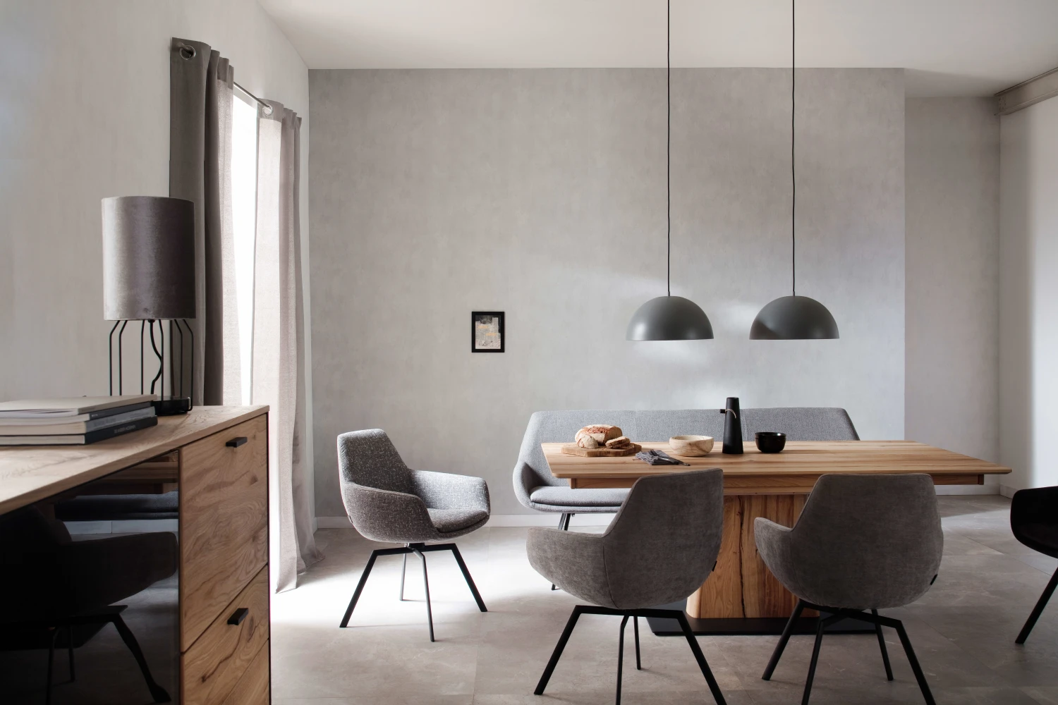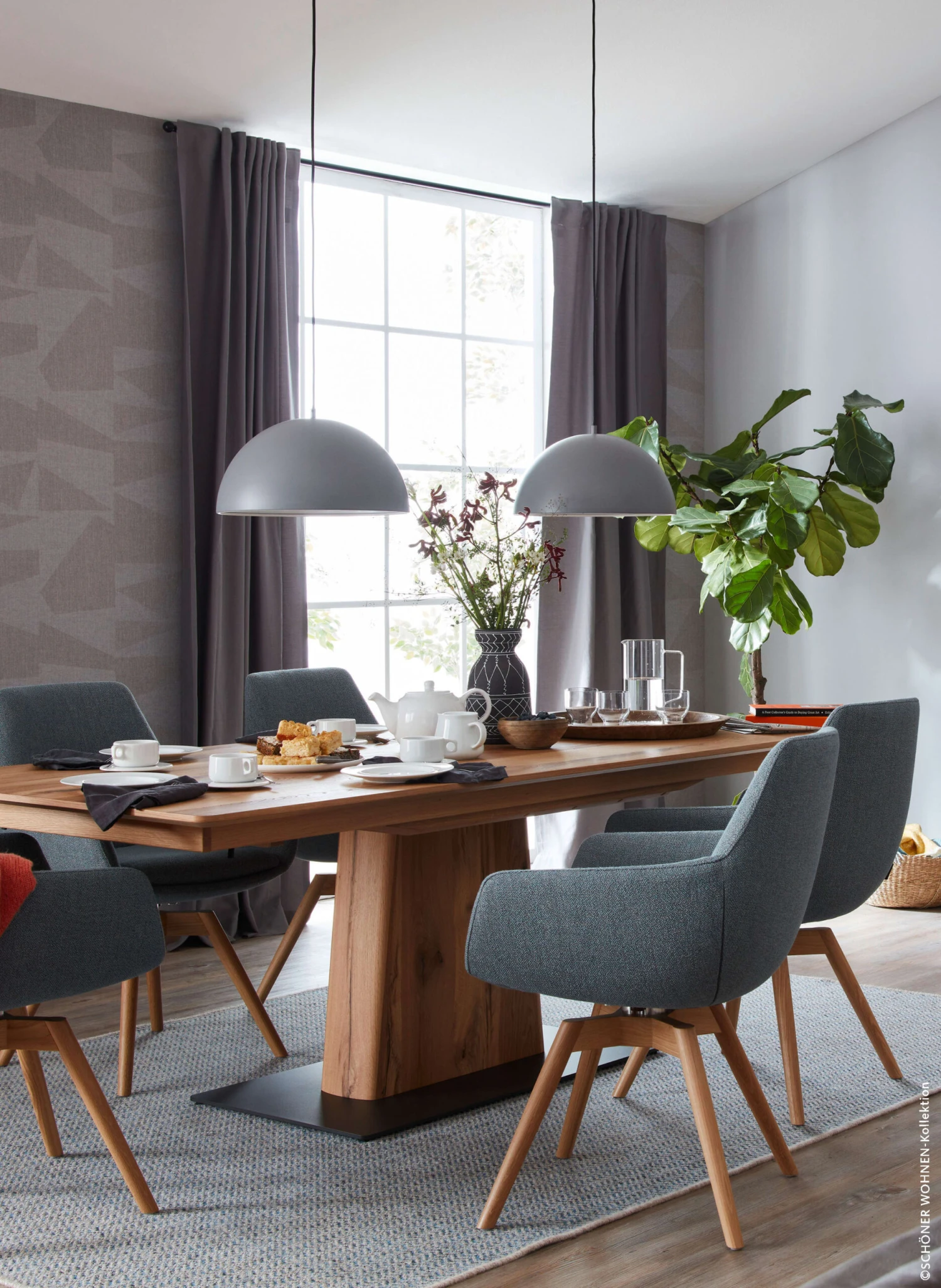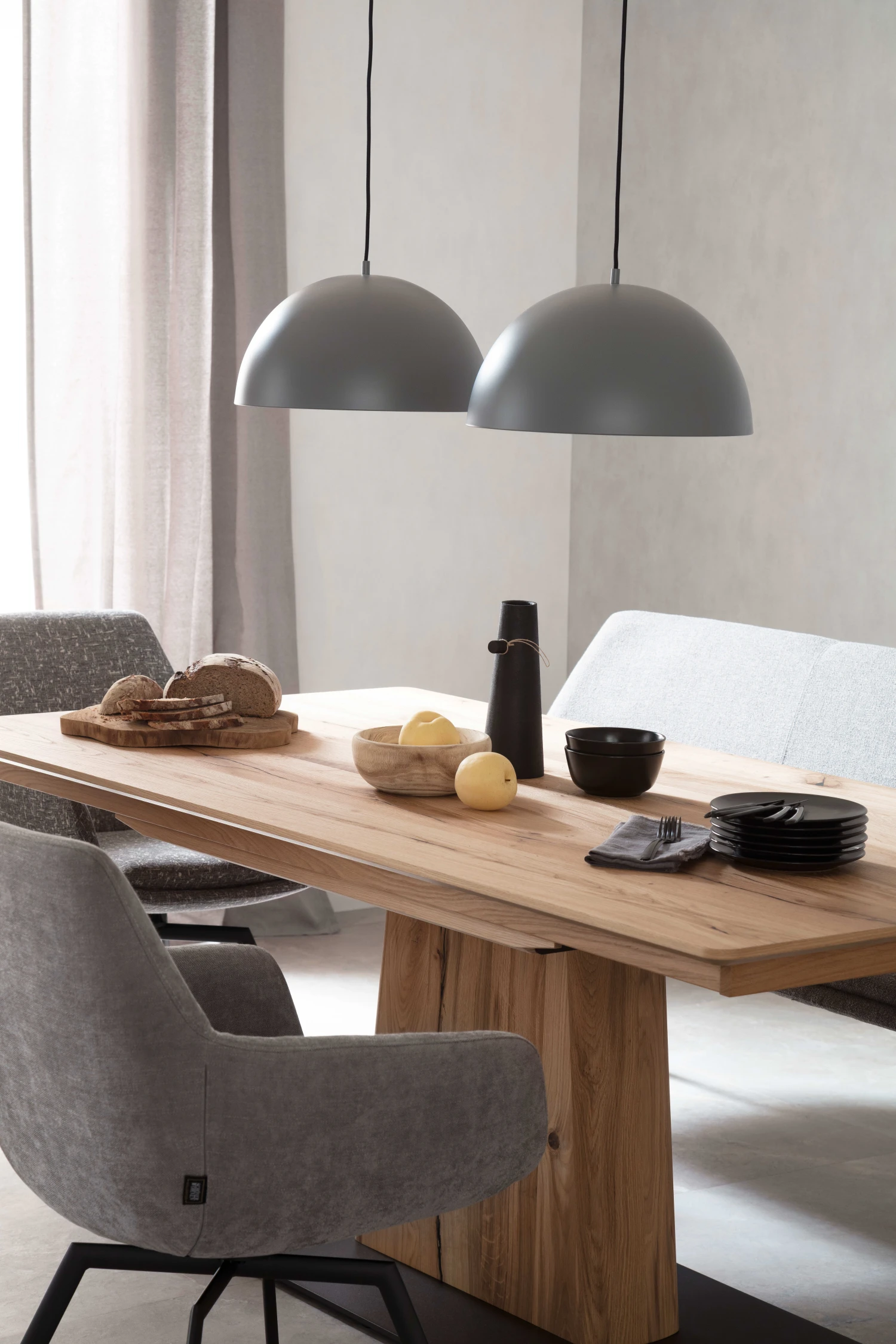 Skandinavische Zurückhaltung: Die Leuchten der Serie KIA aus der SCHÖNER WOHNEN-Kollektion sind schlichte Schönheiten, die mühelos miteinander und untereinander kombinierbar sind und mit nordischer Gelassenheit Gemütlichkeit in Räume zaubern. Als Tisch-, Pendel- und Wandleuchten in den Non-Colours Weiß, Grau und Schwarz fühlen sich die Nordlichter in jeder Umgebung wohl. Die graue Pendelleuchte mit einem Durchmesser von 40 cm ist auf das Wesentliche reduziert. Durch die weiße Innenbeschichtung der Leuchte ist eine helle Ausleuchtung gegeben. Das 250 cm lange schwarze Textilkabel sorgt dafür, dass sich die Pendelleuchte auch in Altbauten wohlfühlt und in der richtigen Höhe über dem Tisch platziert werden kann. Bei langen Tafeln ehellen gern zwei Pendelleuchten im Duett Szenerie und Gemüter.