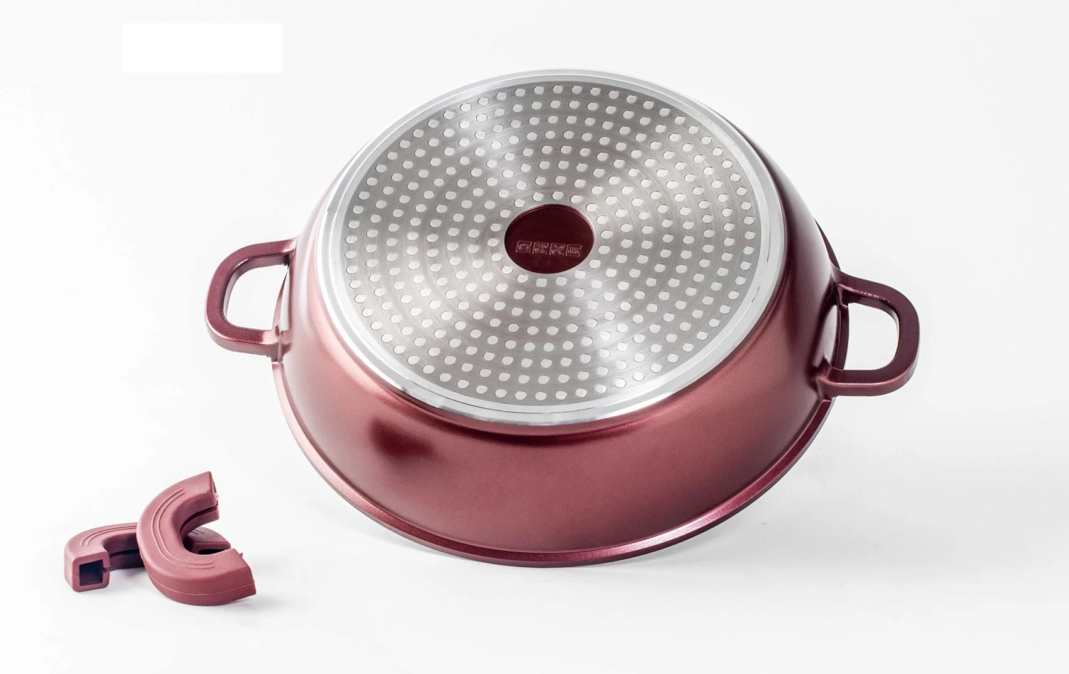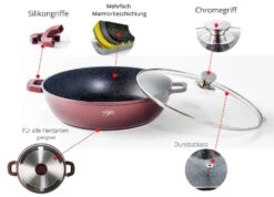 Die Pfanne besteht aus Aluminiumguss und hat eine 3-schichtige Marmorbeschichtung und abnehmbare Silikongriffe. Er kann für alle Arten von Wärmequellen verwendet werden und kann auch im Ofen bis 220 Grad eingesetzt werden. Der mitgelieferte Deckel besteht aus gehärtetem Glas und hat einen Edelstahlknopf