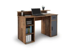 Der Schreibtisch überzeugt mit seinem modernen, edlen Design und bietet reichlich Stauraum. Der Bürotisch verfügt über eine Schublade und einen Schrank mit Tür, sowie 3 offenen Fächer und eine aufgesetzte Ablagefläche über dem Tisch. Die Oberfläche des Arbeitstisches besteht aus einer robusten und pflegeleichten Melaminbeschichtung. Das zweifarbige Design ist ein echter Hingucker und die silbernen/schwarzen Kunststoff-Griffe an Tür und Schublade runden das Design perfekt ab.