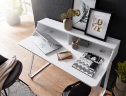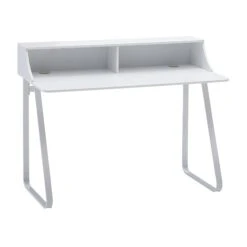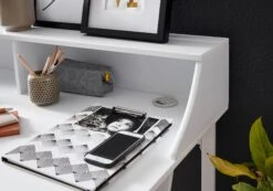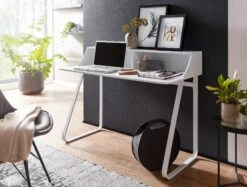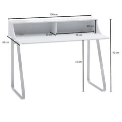 Design Schreibtisch in schlichtem und linientreuem Erscheinungsbild Tischplatte mit Aufsatz und zwei Kabeldurchlässen Geschwungene Tischbeine runden das Design gekonnt ab Abmessungen Breite: 120 cm Tiefe: 60 cm Höhe: 92 cm Boden bis Tischunterkante: 72 cm Innenabmessungen je Regalfach (BxHxT): 58 x 18,5 x 20 cm Tischplattenstärke: 1,5 cm Farbe Kompletter Tisch: Weiß Besonderheiten Vielseitig einsetzbar als Schreib-, Arbeits- oder auch Schminktisch Die robusten Metallbeine bieten einen sicheren Stand Monitor lässt sich bequem auf der Ablage platzieren Durch die Kabeldurchlässe sind Aufladekabel und Co. stets aufgeräumt Minimalistisches Design sorgt für wenig Ablenkung Empfohlene Maximalbelastbarkeit: 10 kg Material Tischplatte: MDF, weiß lackiert Beine: lackierter Stahl Lieferumfang Ein Schreibtisch ohne Dekoration Montageanleitung und -material inklusive Montage Lieferzustand: demontiert und sicher verpackt Pflegehinweis Mit einem feuchten Tuch, evtl. mit mildem Reinigungsmittel abwischen und mit einem trockenen Tuch nachwischen – keine scharfen oder lösungsmittelhaltigen Reiniger verwenden.