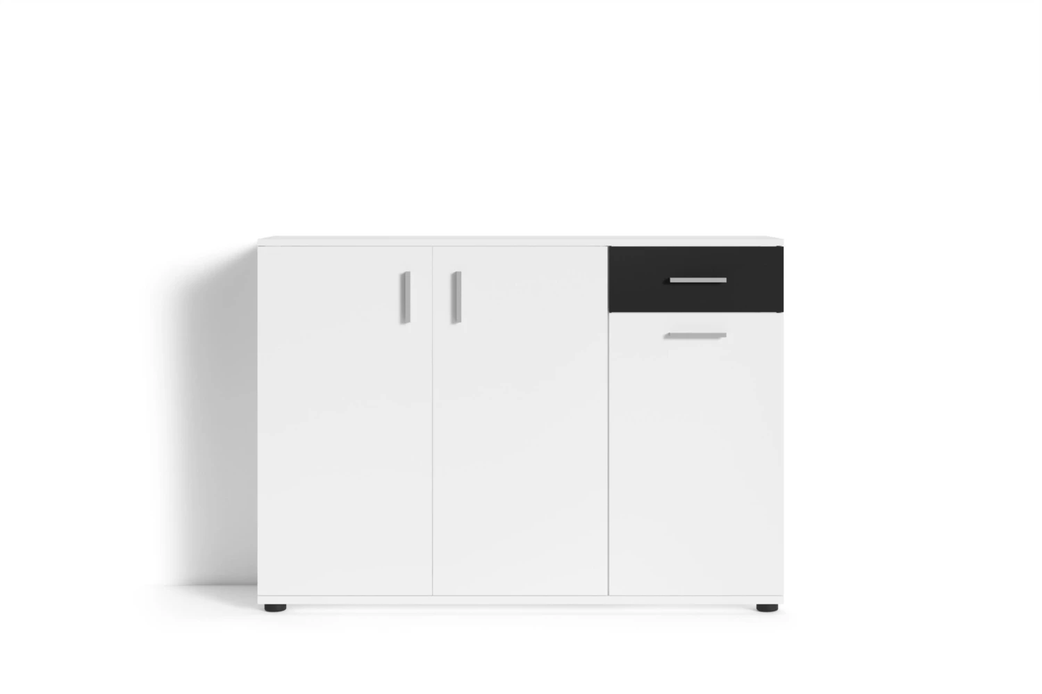 Die Kommode Jakob überzeugt durch ihr modernes und elegantes Design. Dank der durchdachten Größe und Aufteilung kann die Kommode auch als Sideboard verwendet werden und findet so in verschiedensten Räumen Platz. Ob in der Garderobe, im Büro, im Wohnzimmer oder im Abstellraum, die Kommode Jakob macht immer ein gutes Bild. Hinter den drei Türen mit Einlegeböden und der Schublade lassen sich jede Menge Dinge verstauen. Der Schrank hat eine robuste und langlebige Melaminbeschichtung und ist in verschiedenen Farben erhältlich.