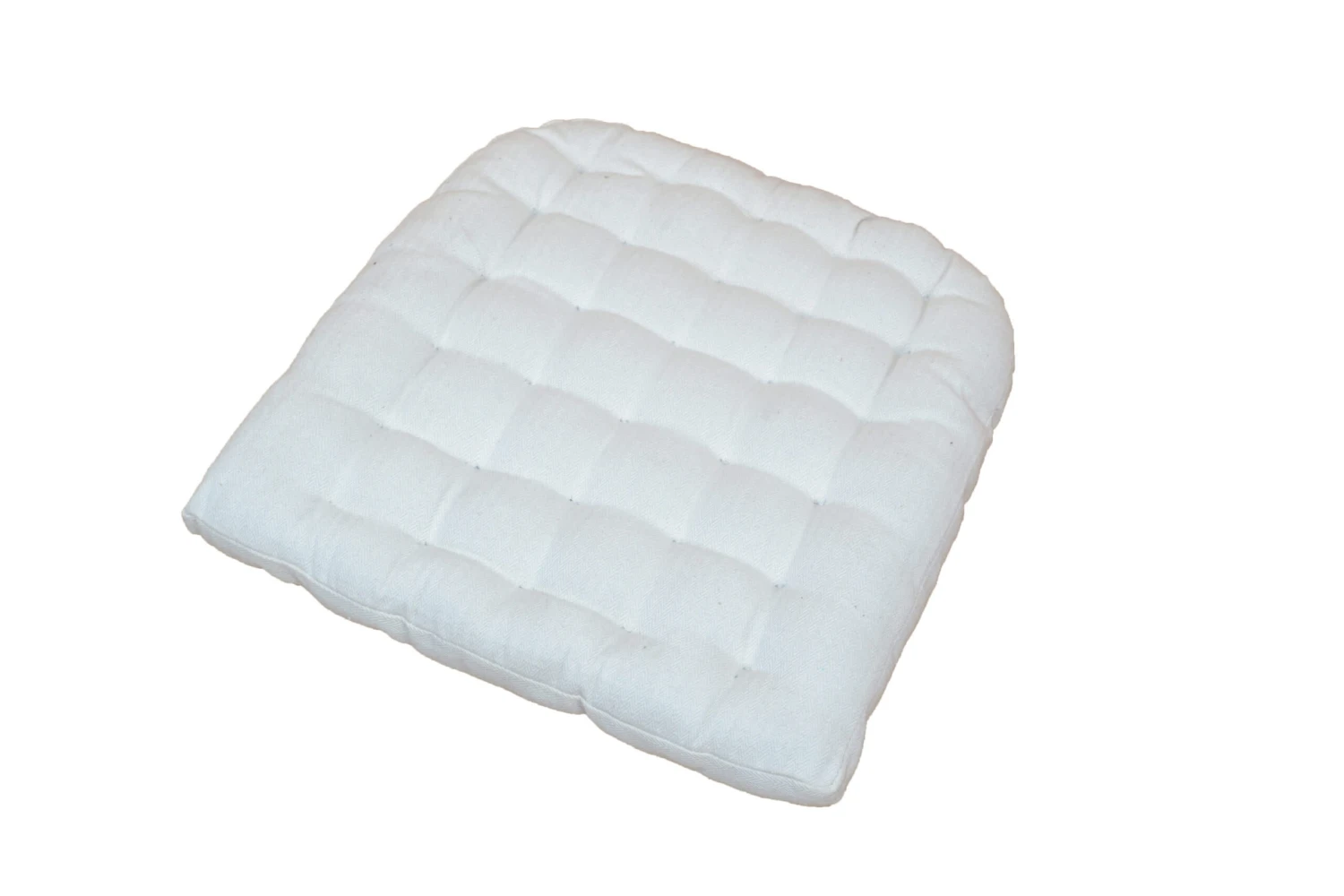 Sitzkissen mit einem cremefarbenen Stoffbezug aus 65% Baumwolle/35% Polyester, mit einem starken Schaumstofffüllung. Das Sitzkissen ist formstabil abgesteppt. Bezug nicht abnehmbar und nicht waschbar.
