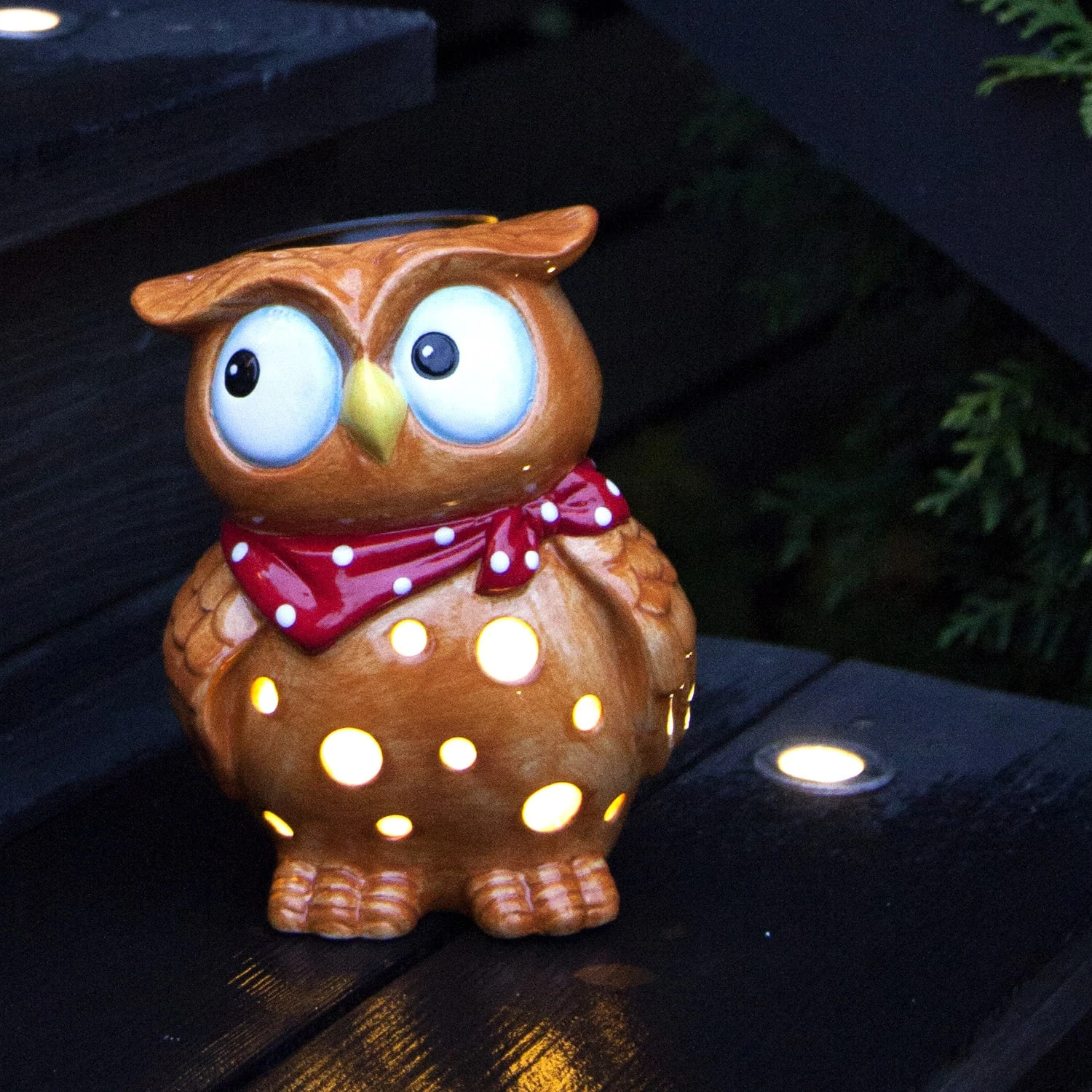 Die Eule wird dabei von Innen heraus durch eine LED beleuchtet. Der eingebaute Dämmerungssensor sorgt dafür, dass bei Sonnenuntergang das Licht automatisch angeht.