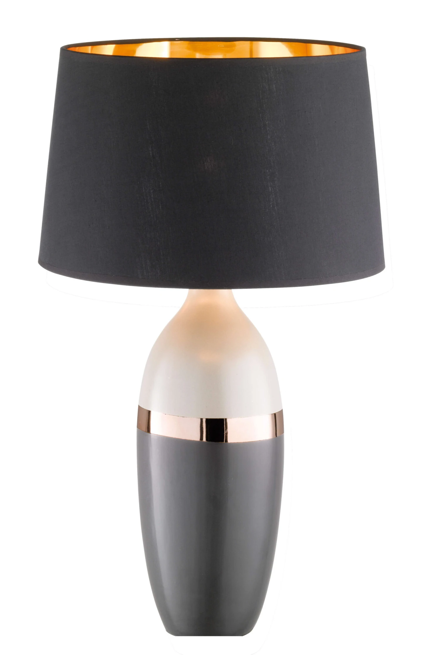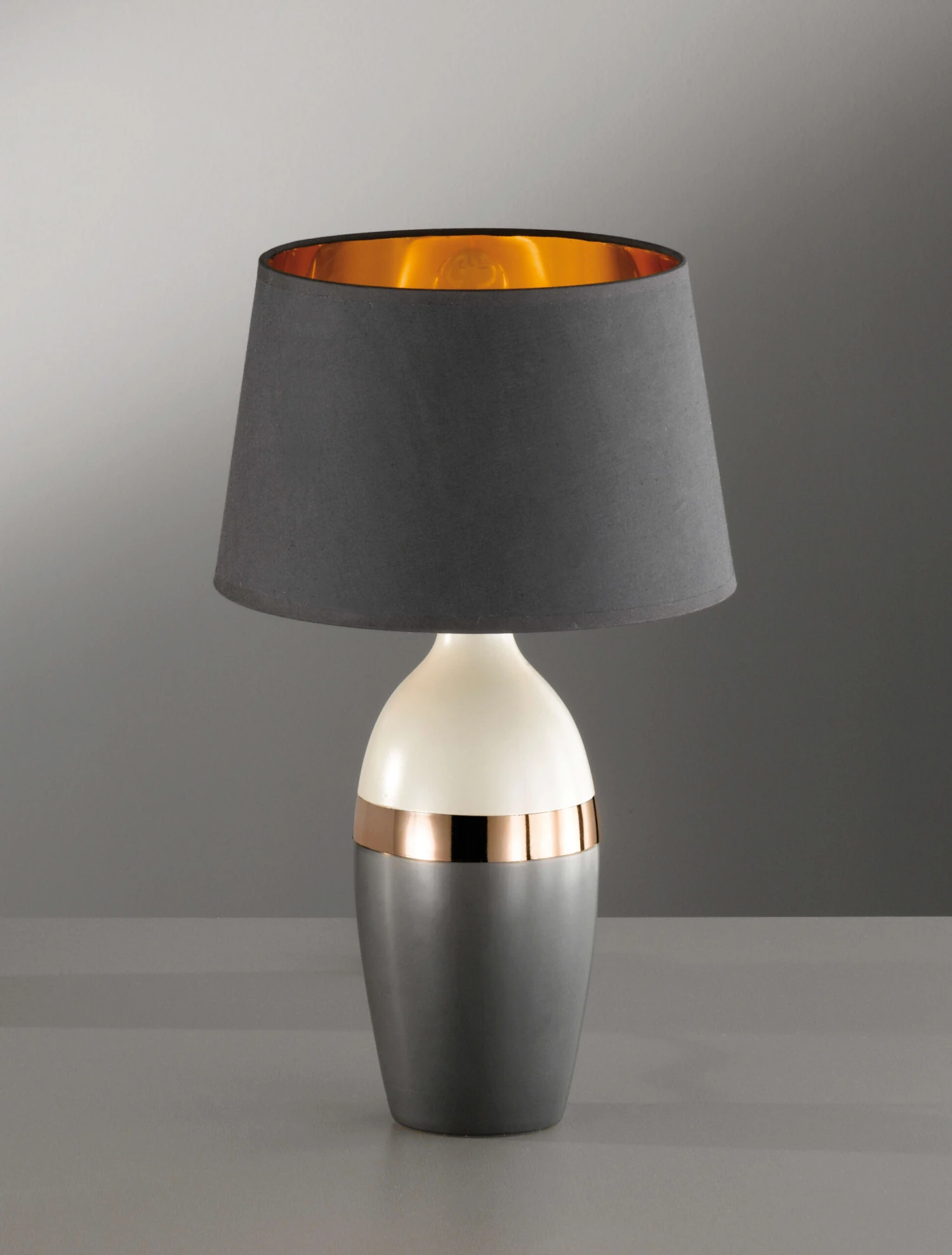 Alle mal hersehen – ein eleganter Auftritt mit zeitgenössischer Leichtigkeit. Überzeugen Sie sich selbst! Klein, aber oho! Leuchten auf Tischen, Kommoden oder Simsen kreieren Höhe in Fenstern und im Raum. Mit Stoffschirmen versehen, machen Sie gemütliches Licht. Immer nach dem Motto: lieber ein paar mehr! Feierabend – effektvolle Lichtinseln im Raum bringen Wärme. Diese Tischleuchte „Tone“ aus Keramik in schwarz/grau/kupferfarben mit dem dekorativen schwarzen Stoffschirm aus dem Hause Fischer & Honsel GmbH ist die beste Basis für ein gut beleuchtetes Heim. Mehrfach platziert verwandelt diese Tischleuchte Ihre Einrichtung in ein Wohnerlebnis.