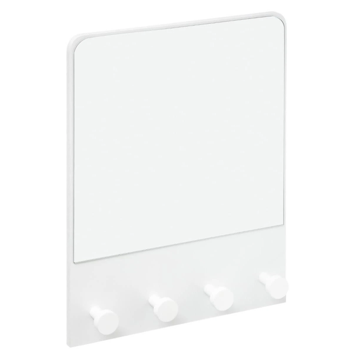 Wandspiegel mit 4 Kleiderbügeln, 50 cm, weiß Einfaches Design mit praktischer Anwendung und eines der angesagtesten Accessoires in letzter Zeit. Der Wandspiegel mit 4 Kleiderbügeln hat eine rechteckige Form und ist mit Hängehaken ausgestattet. Minimalistisches, aber gleichzeitig auffälliges und stilvolles Produkt ist eine großartige Ergänzung für das Haus. Es ist einfach, es für jedes Interieur zu arrangieren. Der Wandspiegel wird sowohl im Flur als auch im Badezimmer schön aussehen. Der Hängespiegel hat die Maße: 37 x 50 x 6 cm, so können Sie frei und bequem sehen, Make-up oder Frisur machen. Dank der MDF-Verarbeitung ist der Rahmen relativ leicht, aber langlebig.