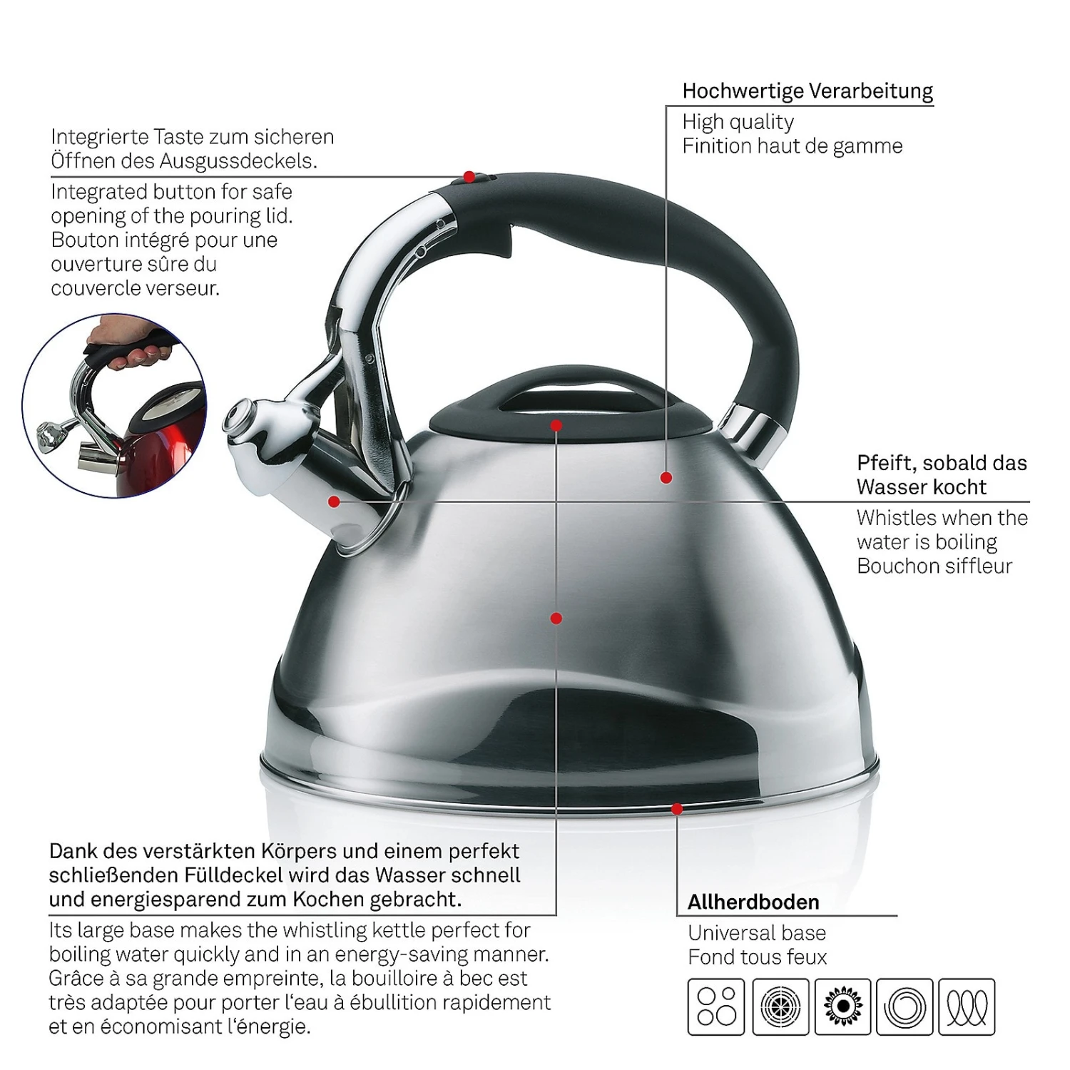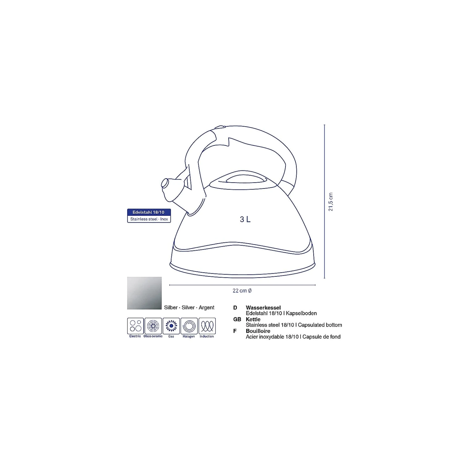 Traditioneller Wasserkessel aus Edelstahl mit KapselbodenDer Wasserkessel VARUS ist für alle Herdarten geeignet, also auch für Induktionsfelder. Der Griff ist rutschfest und hat den Öffner zum Ausgießen des heißen Wassers praktisch integriert, sodass man nicht mit dem heißen Wasserdampf in Berürung kommt. Ø 22 cm, Fassungsvermögen 3 Liter. Der schicke und doch nützliche Wasserkocher ist in 5 unterschiedlichen Farbvarianten erhältlich und fügt sich so als stilvolles Designelement in jede Küchenaussattung ein.