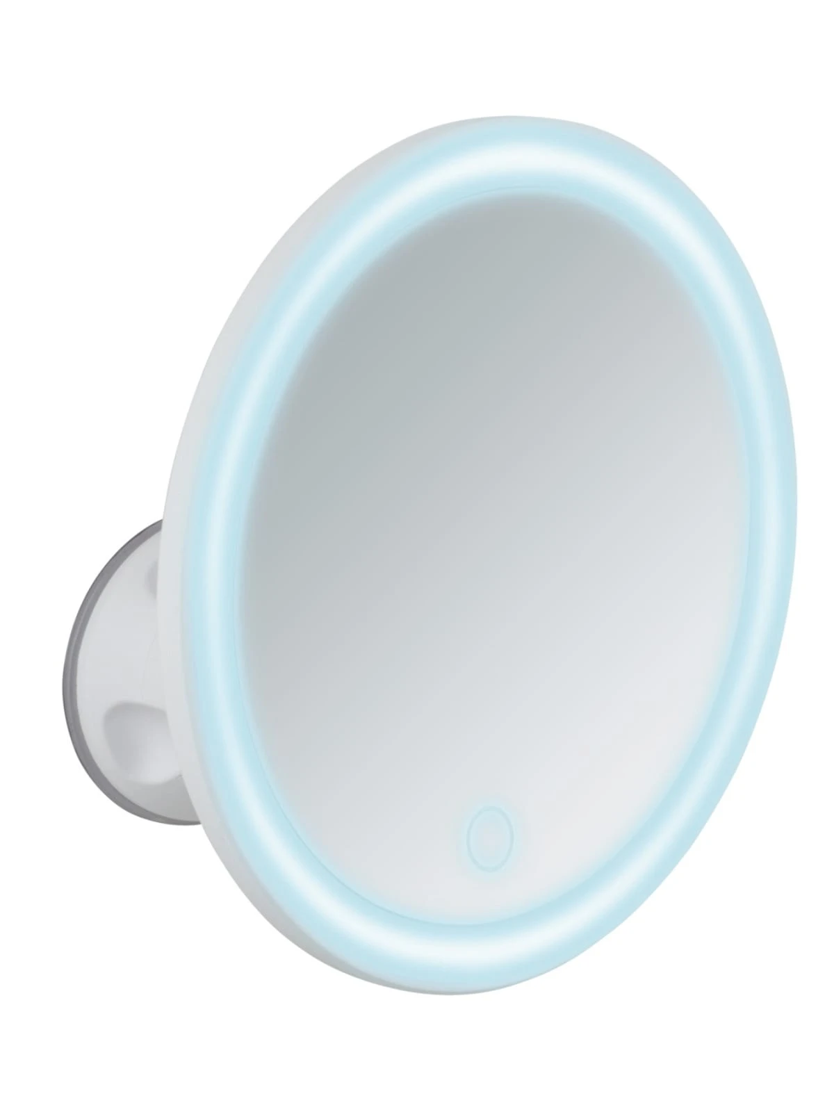 Durch seine 500% vergrößernde Spiegelfläche (Ø 17,5 cm) eignet sich der Wandspiegel aus weißem Kunststoff besonders gut für den kosmetischen Einsatz – für mehr Freude beim Schminken und Rasieren.